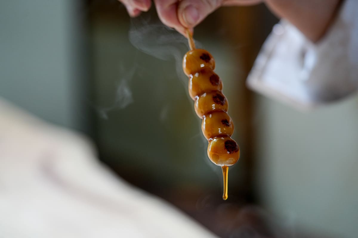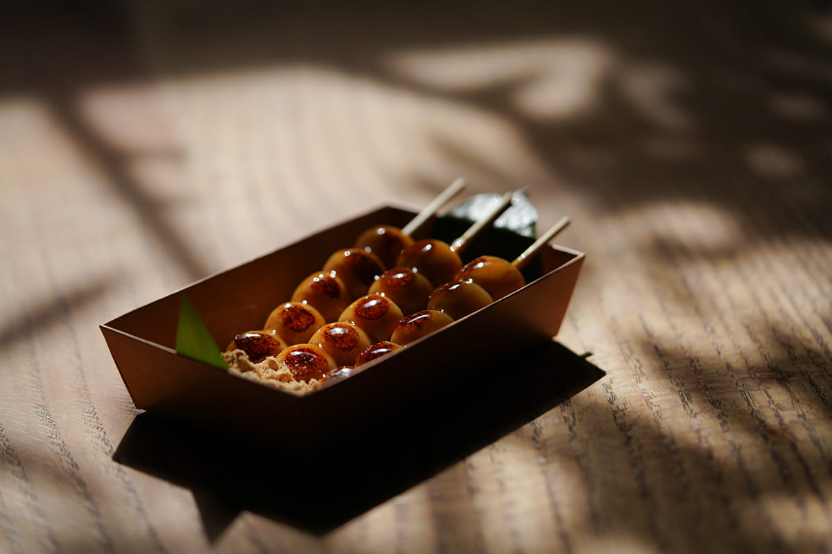 香ばしく焼き上げた生麩に、とろりとしたみたらし餡をまとわせた一串は、どこか懐かしく、それでいて新しい味わい。